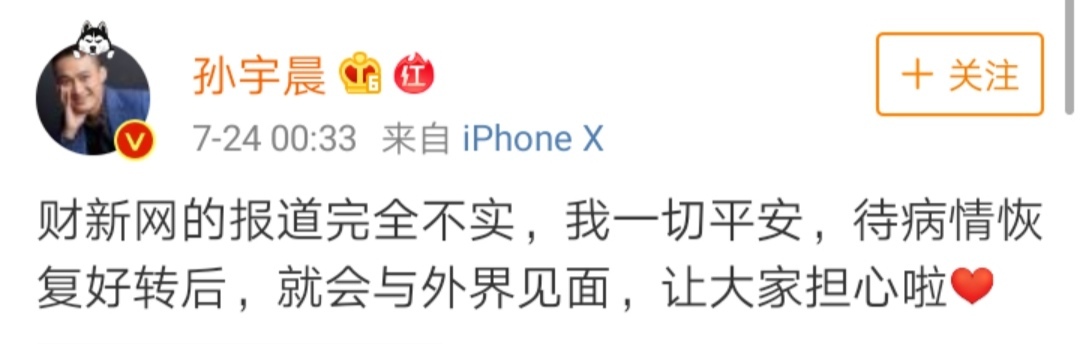 而孫宇晨微(wēi)博也(yě)于7月(yuè)24日(rì)淩晨發π§布消息對(duì)相(xiàng)關報(bào)道(d£∑←€ào)予以否認。孫宇晨微(wēi)博中表示,待病情恢複好(hǎo≤∏α§)轉後,會(huì)與外(wài)界見(jiàn)面。