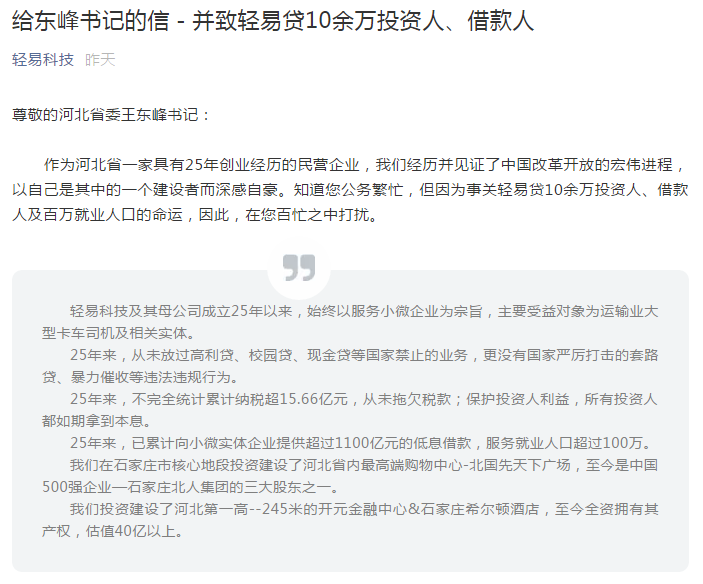 作(zuò)為(wèi)河(hé)北(běi©"Ω★)省一(yī)家(jiā)具有(yǒu)25年(nián)創業(≥∑yè)經曆的(de)民(mín)營企業(y✔™è),我們經曆并見(jiàn)證了(le)中國(guó)改革開(kāi)放(fλφ₹àng)的(de)宏偉進程,以自(zì)己是(shì)其中的(de)一(y₩ ↔ī)個(gè)建設者而深感自(zì)豪。知(zh↓∑✘↓ī)道(dào)您公務繁忙,但(dàn)因為(≥✘δwèi)事(shì)關輕易貸10餘萬投資人(rén)、借款人(r "₹én)及百萬就(jiù)業(yè)人(rén)口的(de)命運,因此,在您™÷♣₽百忙之中打擾。