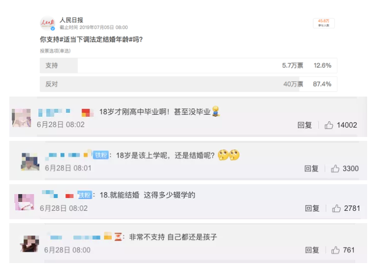 此前,人(rén)民(mín)日(rì)報(bào)微(wēi)博發↕♠ 起的(de)投票(piào)中,超過87%的(de)網友(y>"ǒu)反對(duì)下(xià)調法定結婚年(nián)齡。很(hěn)多(>δduō)人(rén)認為(wèi),18歲才高(gāo)中畢業(y≤∏✔è),自(zì)己還(hái)是(shì)個(gè)孩子(zǐ)……