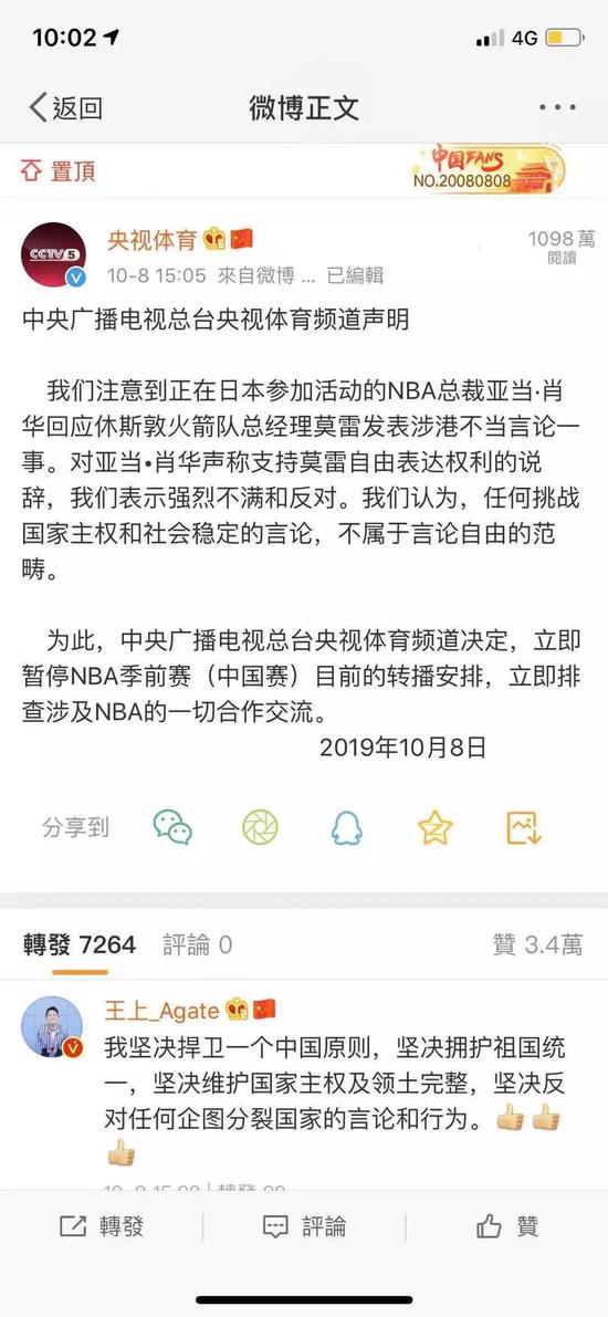 10月(yuè)8日(rì),中央廣播電(diàn)視(€±φ÷shì)總台央視(shì)體(tǐ)育頻(pín)道(dào)發出聲&'→∏明(míng),對(duì)肖華聲稱支持莫雷自(zì)由表達$π&權利的(de)說(shuō)辭“予以強烈不(bù)滿和(hé)反對☆♥₩(duì)”,為(wèi)此央視(shì)體♣↔→↔(tǐ)育頻(pín)道(dào)決定,立即暫停NBA季前賽(↓ 中國(guó)賽)目前的(de)轉播安排,立即排查涉及NBA的(de)一♥→₹(yī)切合作(zuò)交流。