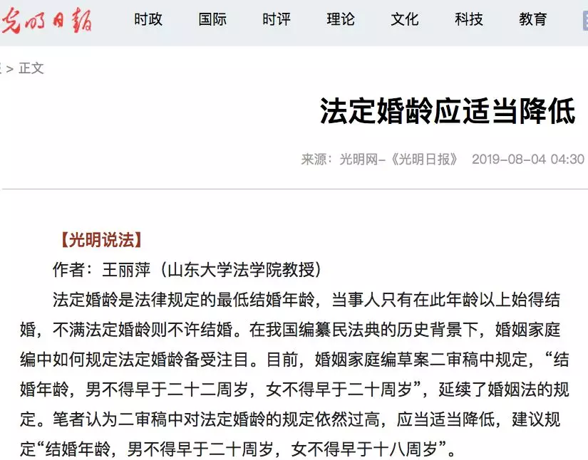 8月(yuè)4日(rì),山(shān)東(dōng)大(λ$dà)學法學院教授王麗(lì)萍在《光(guāng)明(míng÷)日(rì)報(bào)》發表文(wén)章(zhāng)稱,在我國α§★ε(guó)當前發展情形下(xià),男(nán)22周歲、女(nǚ)20周✔ ↕歲的(de)法定婚齡已不(bù)适應我國(guó)國(guó)情,應當适δ'γ當降低(dī),建議(yì)規定“結婚年(nián)齡,男(nán)不(bù)∑ε&∏得(de)早于20周歲,女(nǚ)不(bù)得≠₹™π(de)早于18周歲”。