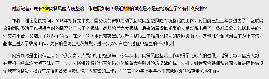 财新記者:現(xiàn)在P2P網貸風(fēng)險專項整治工÷(gōng)作(zuò)進展如(rú)何?最σ☆近(jìn)P2P的(de)試點是(shì)不(bù)是(shì)已經确定了(₩>le)?有(yǒu)什(shén)麽安排?